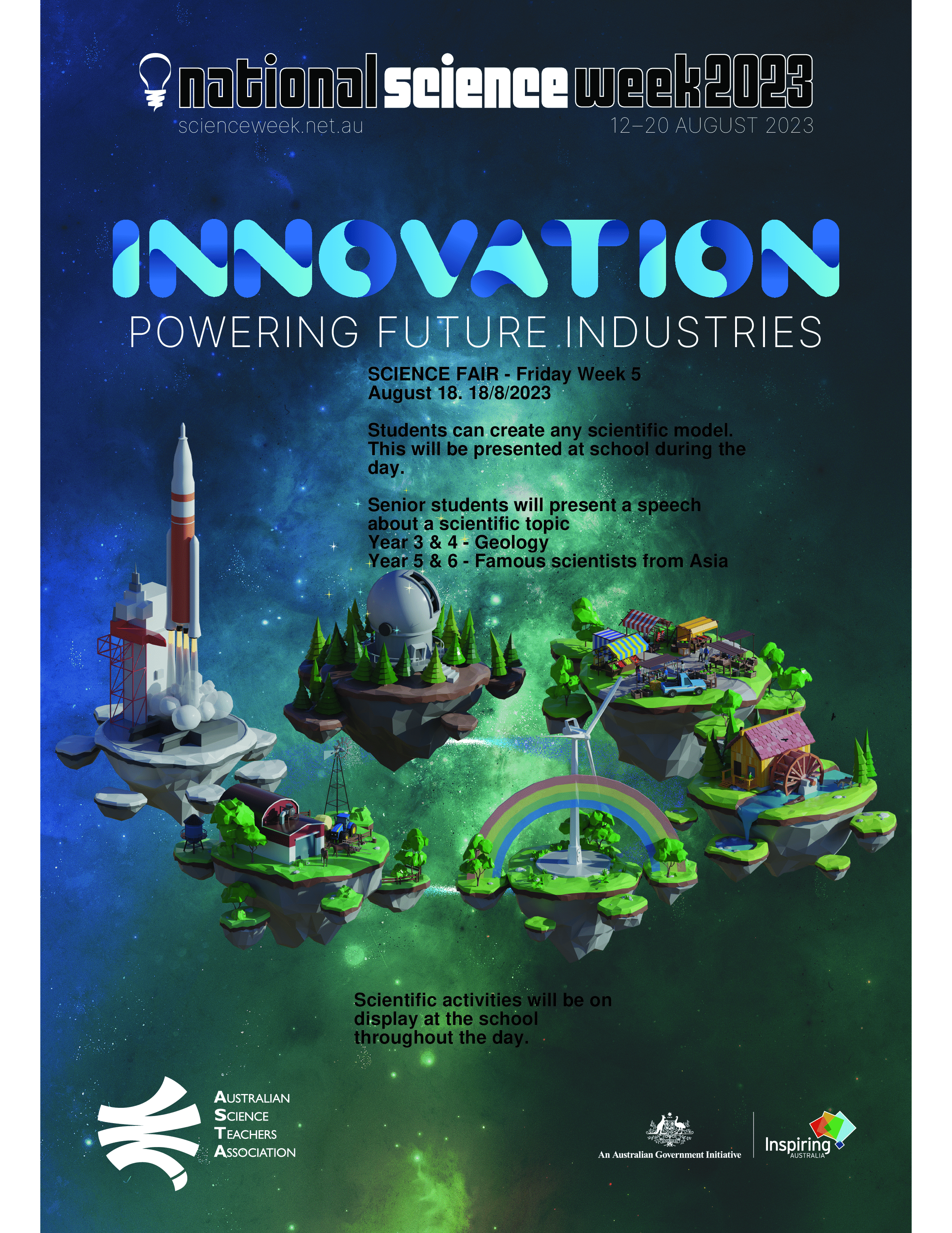 The theme for National Science Week this year is: Innovation: Powering Future Industries. Some ideas for displays might be - analysis of minerals, solar system models, vehicles propelled by elastic bands, small chemical reactions, models to prevent disasters, examples of erosion and many other great ideas.